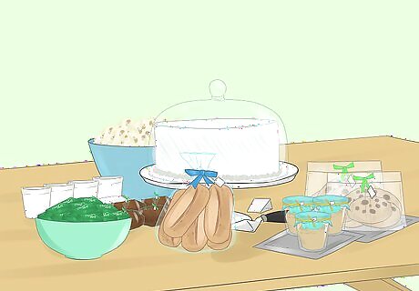Place cakes on their stands in the middle of the table. Set out three trays and put cupcakes in one, muffins in another, and cookies in the last one. If you are selling popcorn, you will have to use one more tray and place the cups in them for when you are ready to use them. Arrange brownies and the loaves of bread on plates, and arrange them in whichever way looks best to you.