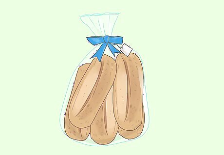 Wrap up loaves of handmade bread. Put each into a clear bag. Tie it up carefully with a ribbon, and slip a label onto the end of the ribbon before you tie it. Trim the excess ribbon to desired length.