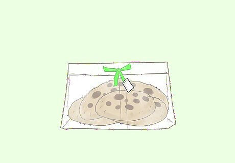 Package cupcakes and muffins. Put each cupcake or muffin into a clear plastic cup. On the side, tape the label. Hole punch a sheet of colored plastic wrap, and thread ribbon through the holes. Then tie the ribbon around the cup, and trim anything unneeded off.