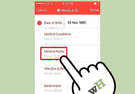 Enter any medical notes you want to share. As you scroll down, you'll see several entries that you can add more data to. Each of the following sections allows you to enter brief notes: Medical Conditions - List any conditions that emergency responders should know about. Medical Notes - Enter miscellaneous notes related to your health in this field. Allergies & Reactions - Enter any serious allergies or reactions you experience here that may affect responders. Medications - List any essential medications here so that they can be administered by responders if necessary.