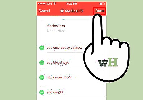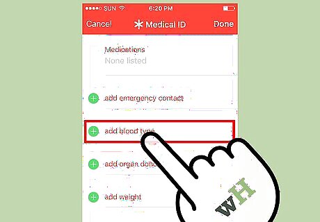 Enter additional medical information. There are several more entries you can fill out with more medical information, which can help responders. This information is not added to your Health Data in the Health app, it is only used for the Medical ID: Tap "add blood type" to specify your blood type in case a transfusion is necessary. Tap "add organ donor" to indicate whether or not you are an organ donor. Tap "add weight" and "add height" to enter your weight and height.
