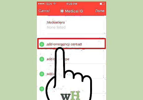 Add emergency contact information. Tap the "add emergency contact" entry to add a contact to the ID. Your contact list will pop up, allowing you to select the person you want to add.
