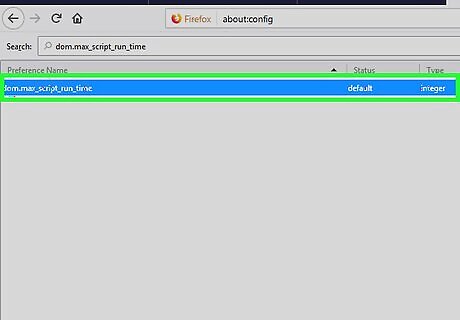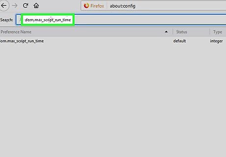 Type dom.max_script_run_time into the ″Search″ bar. It’s at the top of the preferences list. Once you’re finished typing, one result will appear.