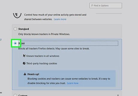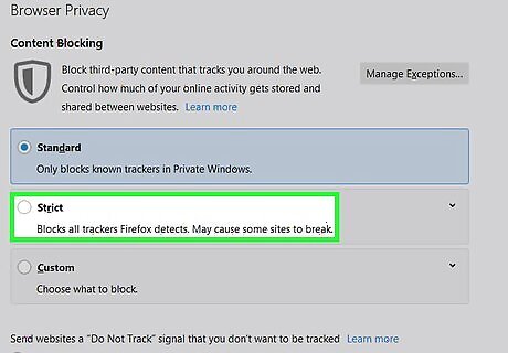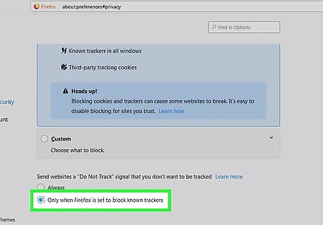 Select an option under ″Send websites a ″Do Not Track″ signal. It’s at the bottom of this section. The best option to select here is Only when Firefox is set to block Detected Trackers. This means as long as you’ve enabled the option in Step 5 (″All Detected Trackers″), you won’t be tracked by any websites—but if you need to turn that feature off for troubleshooting, this one will also turn off automatically.