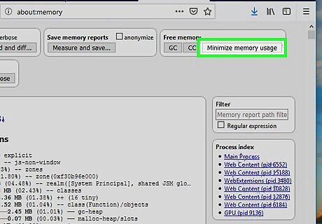 Click Minimize memory usage. It’s near the top-right corner of the page. Firefox will now release in-use memory that’s no longer needed. This should provide a pretty quick boost in speed. If memory usage remains high no matter what you do, your computer may not have enough RAM to support the number of tabs and/or windows you have open at the same time. Try browsing with fewer open tabs and windows, and consider upgrading the RAM in your computer.