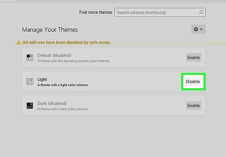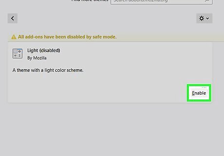 Select one extension or theme to enable. To find the problem add-on, click Enable next to one of the extensions or themes, leaving the rest disabled.
