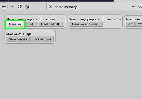 Click Measure in the “Show memory reports” box. If you’re a developer or more advanced user of Firefox, you can use this feature to determine which processes are running and how much memory each process uses. Scroll through the report to view each section. Some add-ons are listed in the memory report by name, but others will only appear as a hex code. If a support representative or developer has requested you run and save a memory report, click Measure and save in the ″Save memory reports″ box, then choose a location to save the report. You can then attach that report to an email or upload it to a bug database if you were asked to do so.