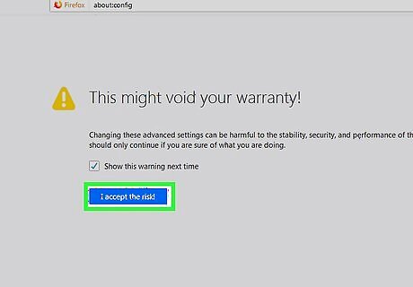 Type about:config into the address bar and press ↵ Enter or ⏎ Return. A warning will appear, letting you know that continuing can void your warranty.
