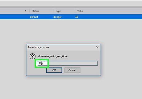 Enter 20 as the value and click OK. Once you make this change, scripts will have 20 seconds to run before displaying the error message that gives you the opportunity to stop the script. If you want to give scripts less time to run before displaying an error message (useful if your computer isn’t powerful enough to run larger scripts), enter the desired number of seconds (any amount over 0, as 0 means ″indefinite″) instead.