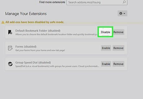 Browse the web. If it’s much faster to use Firefox in Safe Mode, it’s probably because one of your add-ons is acting up. See Disabling Add-ons to learn how to turn these features off. Start by turning all of them off. Then, enable just one add-on and try browsing with it. If browsing is still nice and fast, you can leave that add-on enabled and try another. Keep enabling add-ons until you’ve found the one that’s causing problems.