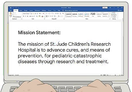 Formulate your mission statement. As a nonprofit organization, you exist to accomplish your mission based upon your purpose, services and values. The mission statement is a concise expression that covers in one or two sentences the name of the organization, what it does, for whom it performs services and where it dispenses service. It should also portray how your organization is distinct from others like it. Make your mission statement compelling. It will be used in all published materials, funding requests and public relations handouts. Use some of these mission statements as examples: "The mission of St. Jude Children's Research Hospital is to advance cures, and means of prevention, for pediatric catastrophic diseases through research and treatment." "The National Mental Health Association is dedicated to promoting mental health, preventing mental disorders and achieving victory over mental illnesses through advocacy, education, research and service." "The National Consumer Supporter Technical Assistance Center's purpose is to strengthen consumer organizations by providing technical assistance in the forms of research, informational materials, and financial aid." "The mission of Texas Mental Health Consumers is to organize, encourage, and educate mental health consumers in Texas. TMHC supports and promotes the mental health recovery process through peer directed and operated services, advocacy, economic development, and participation in public mental health policy design."