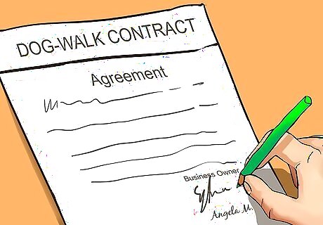 Create a contract. Write up a contract and make sure to require that every customer signs it before you walk their dog to ensure that both you and the customer are clear on your expectations. If you can, take a look at an existing company’s contract and model yours similarly. Ask for help from someone who’s experienced in business or the law to make sure that you’re fully protected and not forgetting any important points. Some things you should include in your contract are: Where you walk dogs How long you walk dogs for How you handle billing and payment Whether there are certain breeds you don’t handle How many dogs you walk at once Statements regarding liability if your dog gets aggressive or out of control