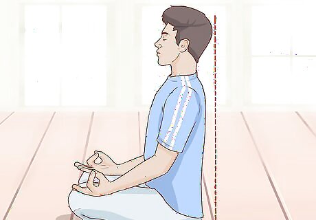 Keep a solid posture. Keeping an upright and solid posture will help you maintain attention and increase circulation. This may take some strength at first, but over time you core will adjust and be able to support you for longer amounts of time. A general rule for meditation posture is to stay straight and stay relaxed. Try to imagine that the top of your head is connected to a string and that the rest of your spine is hanging with gravity. If you notice that you begin to slouch or that sitting upright becomes uncomfortable, take a different posture or take a rest.