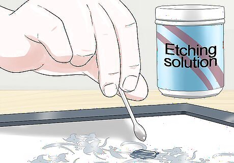 Apply an etching solution to the open parts of the stencil. You can use a bristle brush, or a cotton swab in a pinch. Don’t touch the glass with your brush or cotton swab, however-- your brush marks will show up. Instead, use generous amounts of cream, and daub it onto the surface of the glass. You can buy an etching solution online here. Use a designated brush-- etching solutions are made of acid and can damage most brushes.