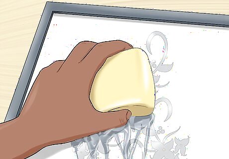 Rinse the glass. Depending on the kind of etching solution that you use, your wait time may be as little as 45 seconds. Use a wet sponge and a bucket to remove the etching cream. Rinse the glass carefully with the sponge. Etching cream can be very potent, so do not get it on the rest of the mirror, or it might etch where you do not want it to.