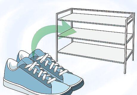 Place shoes in out-of-reach locations. Depending on how large your ferret is, it may even try to steal shoes and drag them to its hiding spot. Prevent this from happening by putting your shoes in a shoe rack and putting your socks in a laundry hamper as soon as you get inside.