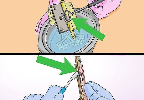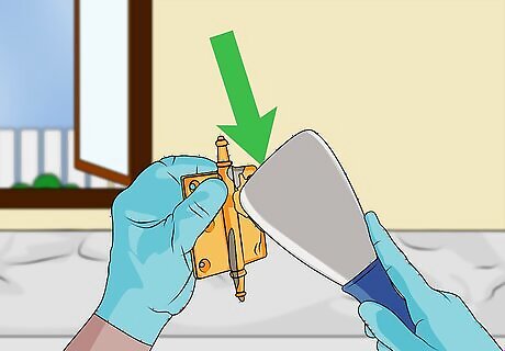 Apply the chemicals to the hardware. The crock pot and boiling water techniques work wonders for paint removal, but it takes time. A chemical paint stripper, like methylene chloride, will remove most paint in under an hour. Apply your chemical according to its user directions. In most cases, you'll need to use an applicator, like a disposable brush, to apply a thick layer of the chemical to the painted surface of the hardware. Generally, chemicals will have a recommended time you should wait before attempting to physically remove the paint with a scraper.