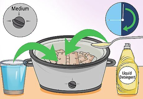 Soak your hardware in soapy water in a crock pot. Insert your hardware into a crock pot. Add water to the crock pot until the hardware is completely covered. Mix in a tablespoon (15 ml) of liquid laundry detergent. Set the crock pot to medium or high. Allow the hardware to soak overnight. Your hardware may still be hot when you go to remove it from the crock pot. Use tongs to prevent yourself from getting burned. After a night of soaking in hot, soapy water, the paint on your hardware should be soft and ready to fall off. Use an old crock pot or buy one secondhand at a thrift store for your paint removal. This will prevent paint from contaminating a crock pot you still use.