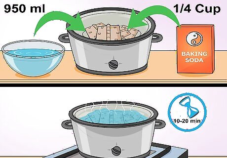 Boil the hardware in water. Use an old pot for this. After boiling the hardware, do not re-use this pot for cooking to prevent food from becoming contaminated with paint particles. Fill the pot halfway with water or enough so the hardware is completely covered. Boil hardware for 10 to 20 minutes. For especially thick or stubborn paint, you may want to use a longer boiling time. Boil your hardware for a few hours for best results. A quart (950 ml) of water mixed with ¼ cup of baking soda should intensify the paint stripping power of this method.