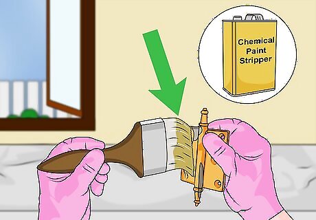 Strip paint with chemicals safely. Most chemical paint removers give off toxic fumes that can be deadly if they build up. Work in a well-ventilated area to prevent this. These chemicals can also be corrosive. Wear gloves and protective eyewear when applying your chemical paint remover. There are many different kinds of paint stripping chemicals. The proper usage and handling for these will vary. Follow the directions for best results. Chemical paint strippers work well for hardware that is too large, heavy, or cumbersome for the crock pot method.