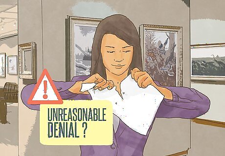 Sue your insurance company if it unreasonably denies your claim. There are many tactics your insurance company might use in order to not pay your claim, and many reasons it might give you for denying payment. It might say that it was your fault you suffered a loss, that your particular policy doesn't cover the exact circumstances of your loss, that you didn't do enough to prevent the loss, or simply that your claim is too high. Regardless of the reason it gives you, if you feel that the reason it is denying your claim doesn't seem fair or that it is not rational, you can sue your insurance company for denying your claim without a good justification for doing so. Make sure to have your insurance company give you the reason it is denying your claim in writing so you will have this for reference later on.