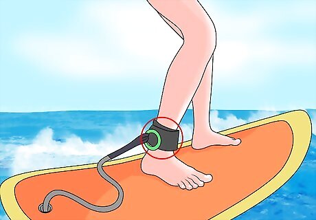 Get a leash for your board. A leash keeps you and your board from separating in the water. If you wipe out, you don't want to be stuck out in the breaking waves without a board. You also don't want your board floating freely into other surfers or smashing up against the rocks. A runaway board can be very dangerous for anyone in the water, not to mention potentially costly. Also, be sure to have a leash string, which connects your leash to the leash plug located at the tail of the board.
