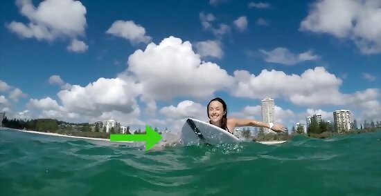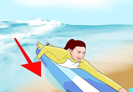 Practice on the ground first. Attach the leash to your back foot and to the tail of your board, then lie belly-down on the board so that your body is lined up straight down the middle of the board. From this position, practice your paddling motion with both arms to get a sense of the muscles that you will be working. If you're right-handed, your back foot will generally be your right foot. This is called "regular" stance. It's called "goofy" stance when the leash is on your left foot. When in doubt, just do what feels most natural. Don't just jump into the water when you're first learning to surf, or you'll get frustrated quickly. Take a little bit of time to practice on the sand, or in the privacy of your backyard, before you're on the beach in front of others.