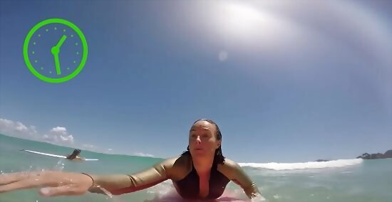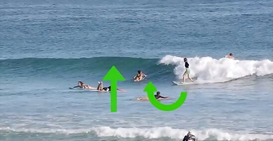 Turn your board and wait for an appropriate wave. Sit back on your board until the nose is up out of the water. Kick your legs in an egg beater motion to turn the board around toward the shore. Position yourself in your sweet spot and get ready to paddle for the wave using long, smooth, deep strokes. When you see a wave coming, get into position as near the peak as you can without appearing to be a "wave hog." When you are satisfied that you are in a good position to catch the wave, paddle like there's no tomorrow and give it all you've got!