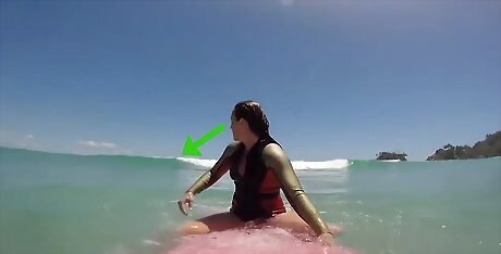 Identify a target spot. You want to be waist deep in the white water, where the waves have already broken. This is the best place to start when you're a beginner. Don't plan on paddling too far out where more advanced surfers might be waiting for a set, but make sure you are in deep enough water to keep from hitting your head if should you fall off your board. Pick a reference point. Choose a landmark on the shore and glance at it periodically as you move into deeper water. This will help you gauge your distance from shore, and can help to reveal any hidden currents that might be moving you.