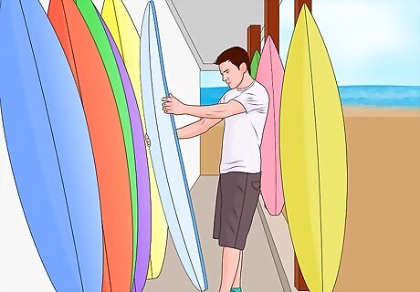 Rent a soft surfboard your first time out. Don't invest in your own surfboard if you've never tried surfing before. At most beaches good for surfing, rental spots will be available close to the beach, offering reasonably cheap rental options, by the hour or by the day. You'll usually be able to choose between fiberglass boards and soft surfboards, sometimes called “soft tops” or "foamies." Soft surfboards are lightweight and much cheaper than epoxy or fiberglass boards. Soft boards are extremely buoyant and durable, making them a good choice for beginners. Your size and weight will contribute to determining which type of board you should learn on. The more weight you have, the bigger the board volume you will need. You may not have a good experience learning to surf if you are trying to learn on a board that is too small for you. If you're not sure what you want, talk to people at the surf shop. Be honest and tell them that you're a first-timer and you want to know what you need to get started.