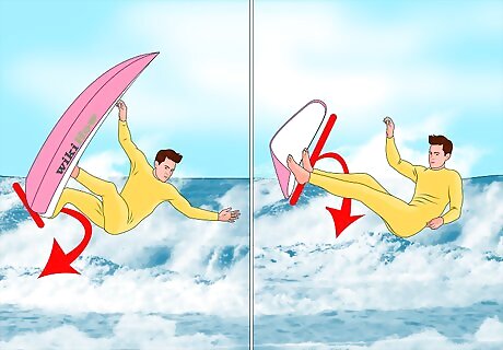 Try turning when you're ready. As you become accustomed to the feeling of surfing, you will probably want to try angling your board across a wave. Lean into your turn with your body, keeping your center of gravity on the board. Use your body to gently dip one rail of your board into the face of the wave. This creates friction/drag that will turn the board. Once you catch the right angle, maintain balance and ride down the curl of the wave. Pick the direction you want to ride across the wave (left or right) early. If the wave is low enough, begin paddling in that direction before the wave hits. For larger waves, wait until you are getting pulled up onto the wave.