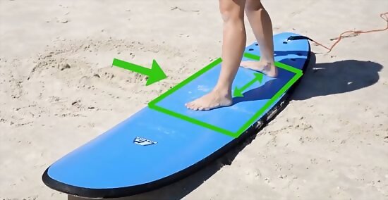 Practice getting up. "Taking off"(or “popping up”) on the wave and standing up on the board takes a bit of practice. While lying on the board, bring your hands up from paddling and place your hands below your chest, palms on the flat of the board while your fingers curl over the sides of the surfboard. In one quick motion, push your body up with your arms and tuck your feet up and under you. Place one foot where your hands pushed up from and the other at least a shoulder’s width behind. As you are beginning, you may find it easier to get up to your knees first and then bring up one foot at a time until you are in a standing position. It's slower than the jump up, but it works effectively for someone not ready for the jump up. Never grab the rails, or edges, of the board during your take off, unless you want to get a nice gash on your chin when your hands slip off your rail. If you find your hands or feet slipping when you try to get up, you may need to rub more wax on your board. You can practice jumping up without a surfboard present, so feel free to do it wherever you have a bit of space until you feel comfortable doing it.