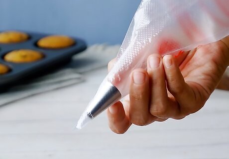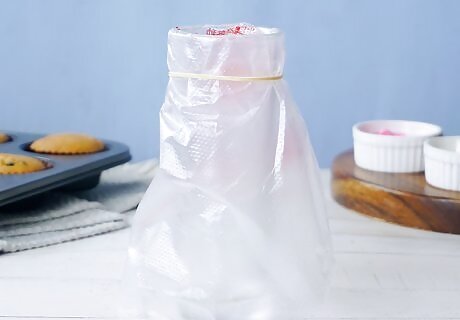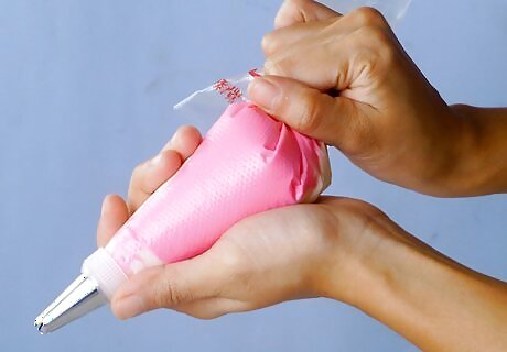 Squeeze out all air bubbles. Remove the rubber band and take the bag from the cup. Then grip the piping bag by the edges and push all the frosting down towards the tip. You can twist the end of the bag to make this easier. Squeeze evenly until a bit of frosting escapes from the tip. If you want, you can secure the end of the bag with a rubber band or twist tie.