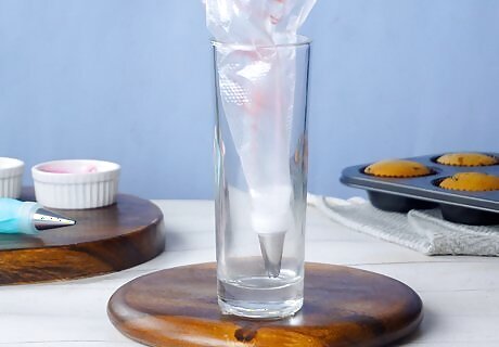 Place the piping bag in a tall cup or glass. The material of the cup doesn’t matter, however, try to make sure it’s not too narrow. Once you have a glass, put the piping bag inside with the tip facing down. Then fold the rest of the bag over and around the edges of the glass. Secure the excess of the bag with a rubber band. You may have to wrap it more than once as you want the piping bag to be secure.