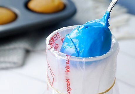 Spoon frosting into the bags. Use a spatula or large spoon and start moving your frosting into the piping bags. Push down, but don’t pack the frosting as you want the tip to remain unfilled. Since you are only putting one frosting in each bag, you can fill them however you’d like. Just make sure you are only filling them around 3/4ths full as you will need to twist the bags closed later.