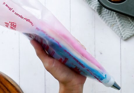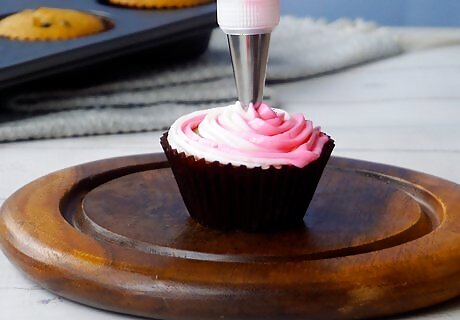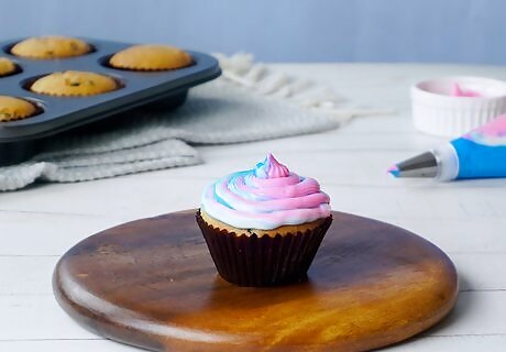 Try a few practice swirls. Depending on how many different types of frosting you have in the bag, it may take longer to get a proper swirl. Try piping a bit onto a paper plate or spare cupcake if possible. It’s likely you will only see one or two of the flavors at first before the rest of them come out. Remember it’s okay to have an uneven swirl. This can even add a bit of character to your cupcakes.