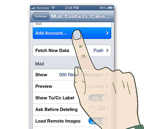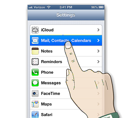 Open Mail, Contacts, Calendars. Tap "Settings" on your home screen, then scroll down and tap "Mail, Contacts, Calendars."