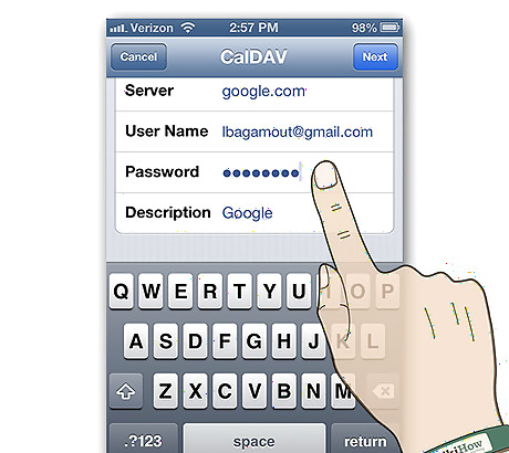Enter the information for the new CalDAV account, then tap Next. Server is google.com. User Name is your email login for Google. Password is your Google password. Description can be anything you like. When you tap Next, your setup is complete.