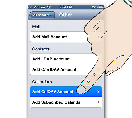 Add a CalDAV account. In the Other control panel, scroll to the Calendars panel, then tap "Add CalDAV account.