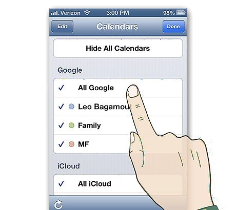 Select the Google calendars you want to show on your iPhone calendar, then tap Done. Within a few moments, the Google calendars you've will be displayed. Syncing is automatic.