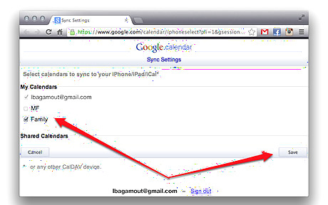 Control the calendars available. To enable or disable multiple calendars in Google, navigate to https://www.google.com/calendar/syncselect and check the calendars you wish to show or hide in your Calendar settings on your iPhone. Click the Save button, and within a few moments, your new settings will take effect. Note that you can still show or hide multiple calendars within the Calendar app, as long as they are enabled in your Google Calendar sync settings.