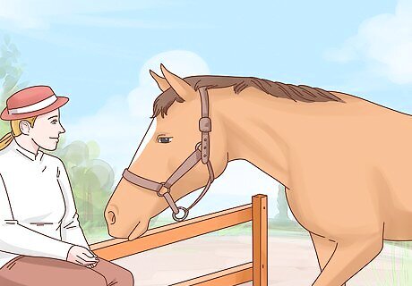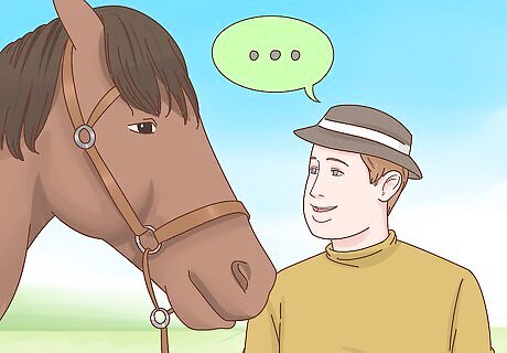 Talk to your horse in a soft, low tone voice. Never yell or use a high-pitched voice around your horse or you may frighten her. Instead, speak to your horse in a soft, low tone voice to help keep her calm and responding to your instructions.