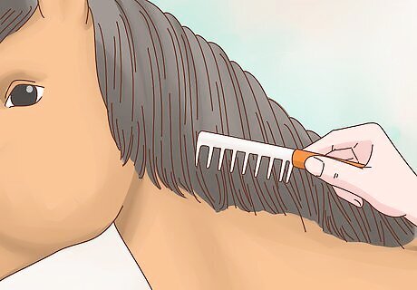 Use a mane comb to untangle your horse’s mane and tail. Be gentle and work through major tangles carefully using your fingers to avoid pulling out or breaking any hairs. You can also use the dandy brush on your horse’s tail to get it nice and soft. Don't brush your horse's mane and tail every day or it will become amazingly thin and it takes three years to regrow.