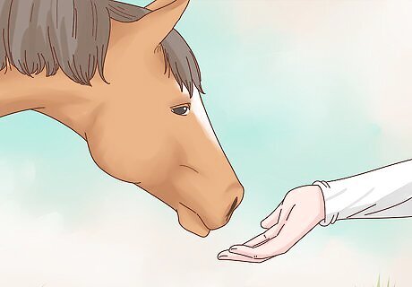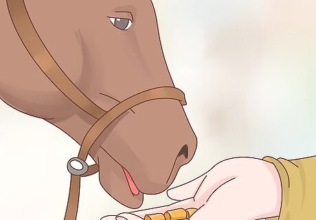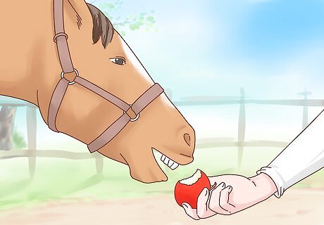Give treats in moderation. Giving treats to your horse when you want to reward her is a great way to bond with your horse as well. Just make sure that you do not overdo it with treats or your horse may learn to expect them or may even try to root around in your clothes for treats. Fresh apples and carrots make great treats for your horse.