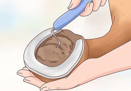 Clean your horse’s hooves. Stand next to your horse facing the horse's rump, and use one hand to bend and support your horse’s hoof. Use the hoof pick to remove any rocks, turf, or other objects that have lodged in your horse’s hoof. Scrape away from you so that you do not cause the objects in the hoof to fly towards your body or face. You should also have your horse's hooves trimmed every 3-8 weeks to keep them in good condition. Shoeing horses is not always necessary. In fact, some experts believe that shoeing can cause problems with the hooves rather than protect them.