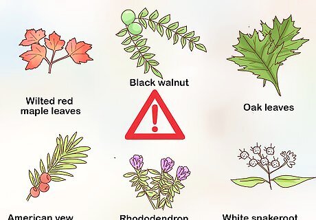 Be aware of plants that are hazardous to horses. If you think that your horse may have been poisoned by something she ate, call your veterinarian or ASPCA Animal Poison Control Center's 24-hour hotline at (888) 426-4435 right away. There are several species of plants and one species of beetle that can poison your horse if she ingests one of them. Potential hazards to your horse include: Wilted red maple leaves Black walnut Oak leaves Taxes species (yew, Japanese yew, American yew, English yew, western yew, oleander and rose laurel) Rhododendron and azalea White snakeroot, richweed, white sanicle, jimmy weed, rayless goldenrod, burrow weed Yellow star thistle, St. Barnaby's thistle, Russian knapweed Blister beetles (sometimes found in alfalfa hay, especially in the Midwest and Southwest) Ragworth/Ragweed