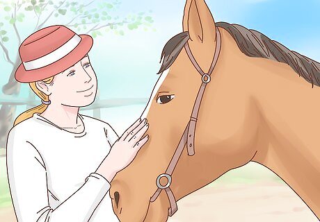 Approach your horse with slow gentle movements and a calm demeanor. Instead of walking straight up to your horse, throwing the saddle on, and going for a ride, slow down a bit. Let your horse sniff your hand and talk to her. Taking time to slow down and be a calming presence will help improve the trust between you and your horse.