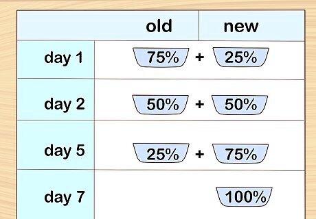 Make gradual changes to your horse’s diet. If you need to change your horse’s feed, do not just switch to the new feed. Start by replacing 25% of the old feed with the new feed. In two days, replace 50% of the old feed with the new feed. Two days after that, replace 75% of the old feed with the new feed. Then two days after that you will be able to give your horse 100% new feed. In addition to making food changes gradually, you should also feed your horse at about the same time every day. Horses perform better when they have a regular feeding schedule. Making drastic changes to your horse’s feed or feeding schedule can lead to equine colic and founder. Equine colic is a condition that causes severe abdominal pain and may even require surgery. Founder is a condition that causes poor circulation and can even lead to the separation of the hoof from the foot. Founder is often fatal.