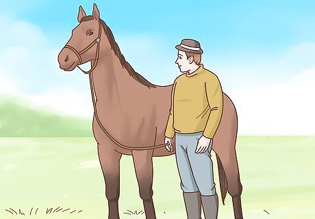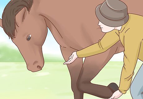 Follow basic rules for safety when training your horse. Every interaction that you have with your horse in an opportunity to teach her something. Make the most of these moments and stay safe by following some basic rules for safety around your horse. Never stand or walk directly behind or in front of your horse. When working with your horse’s head, stand on your horse’s left side at an angle from her head. Talk to your horse and touch her body as you move out of her field of vision. When you need to do something with your horse’s hoof, bend over rather than crouching down.