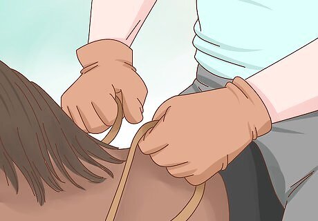 Encourage neck drops. Neck drops are a horse’s way of demonstrating trust or submission. If your horse is willing to drop her neck in your presence then you have a good bond. To get your horse to drop her neck, tug gently on the lead rope below your horse’s head. If your horse does not yield, then keep building your bond and try to request a neck drop some other time.